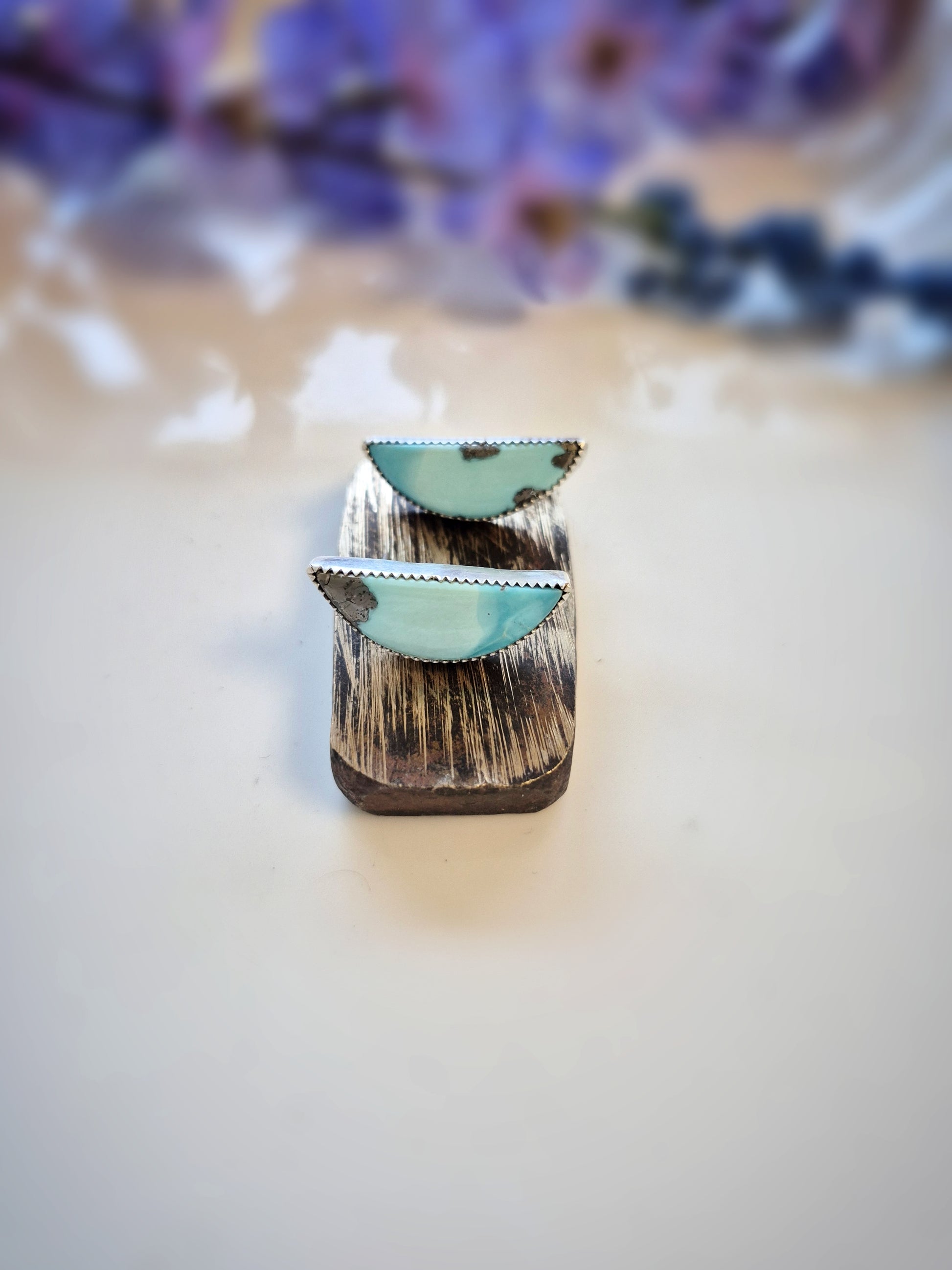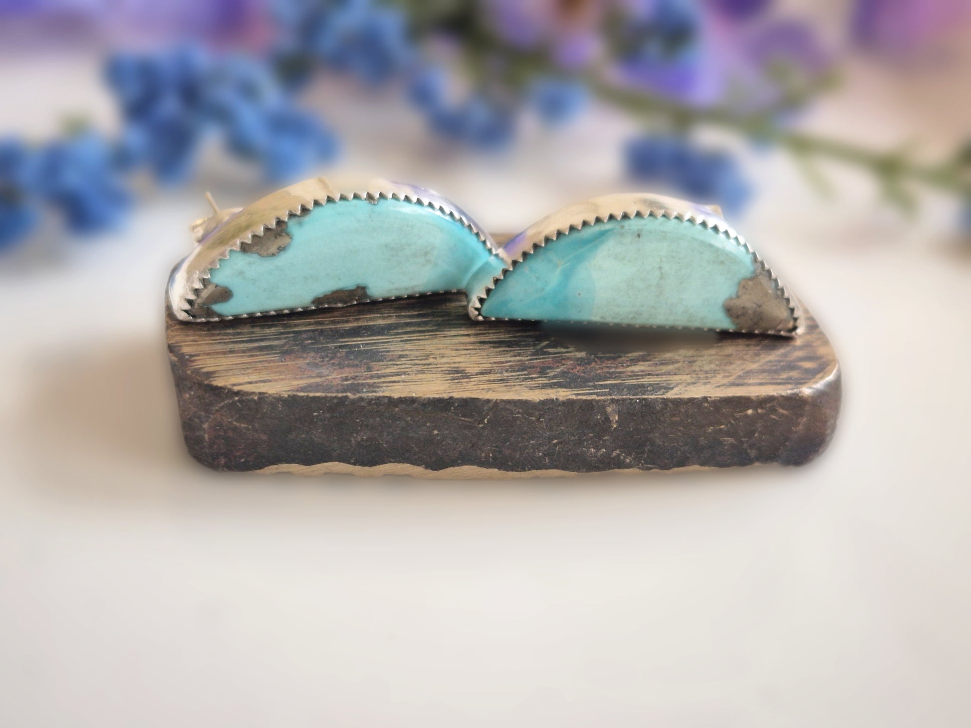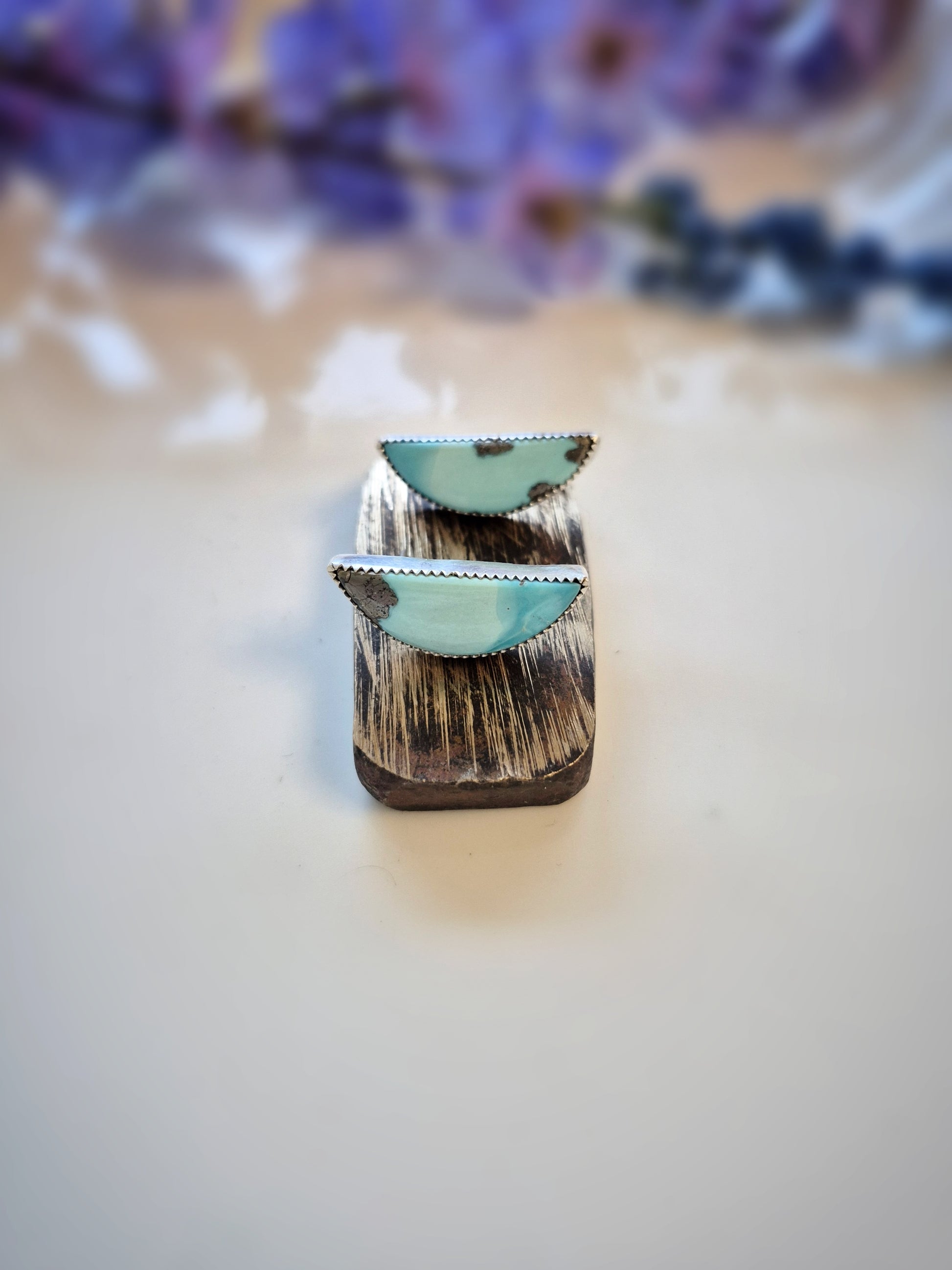The Prairie Strength collection is shaped by quiet resilience. Turquoise in shades of sky and open land, cut into simple crescent forms and strong lines. These studs carry the calm power of wide plains—steady, grounding, and made to remind you of your own strength every time you wear them.