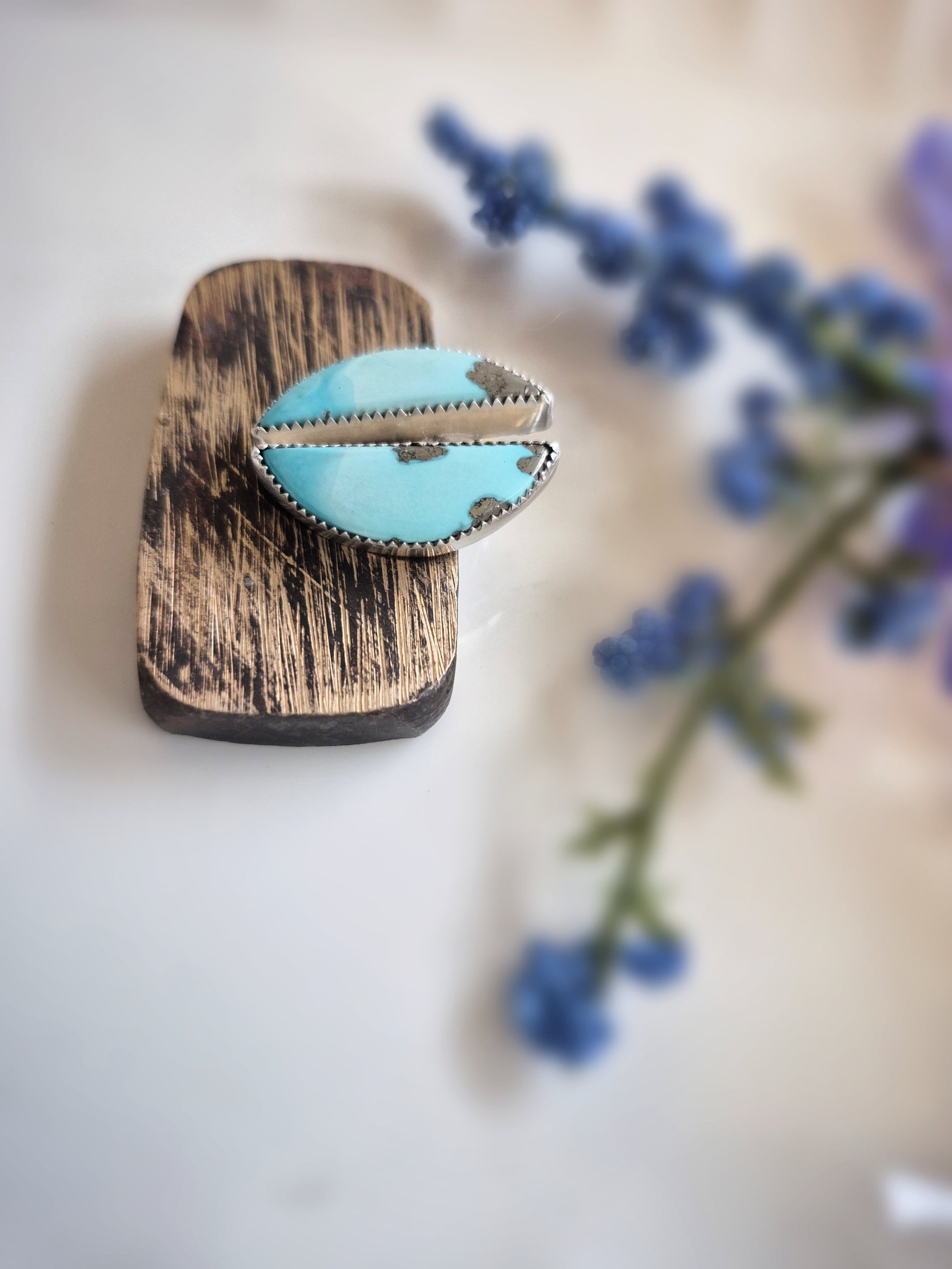 A long crescent of light blue turquoise, with pyrite specks, that speaks in quiet strength. These studs carry a bold silhouette while keeping the simplicity of everyday wear. Light sky blue that feels like resilience.