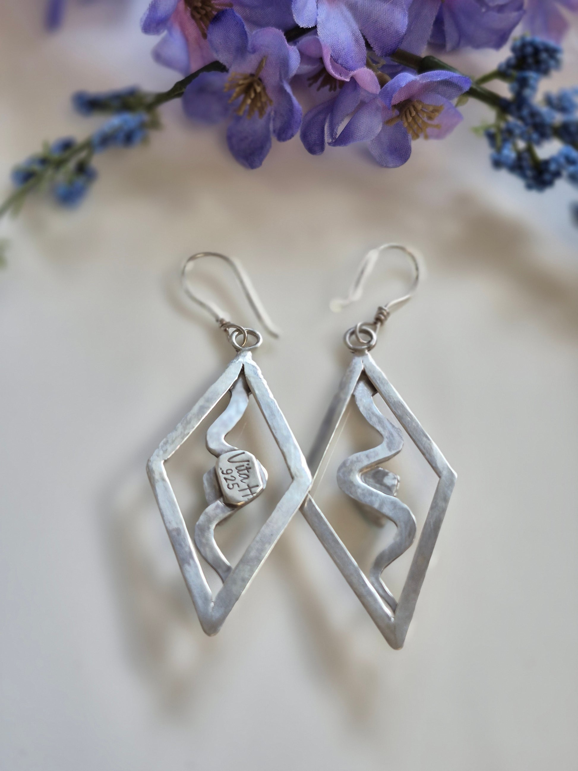In these striking diamond-shaped earrings, a silver serpent stretches gracefully from top to bottom, its curves echoing the flow of transformation. At the heart of the serpent rests a diamond-shaped turquoise stone, glowing like a guiding light. Handcrafted in sterling silver, these earrings are a talisman of renewal, wisdom, and the courage to move forward on your path.