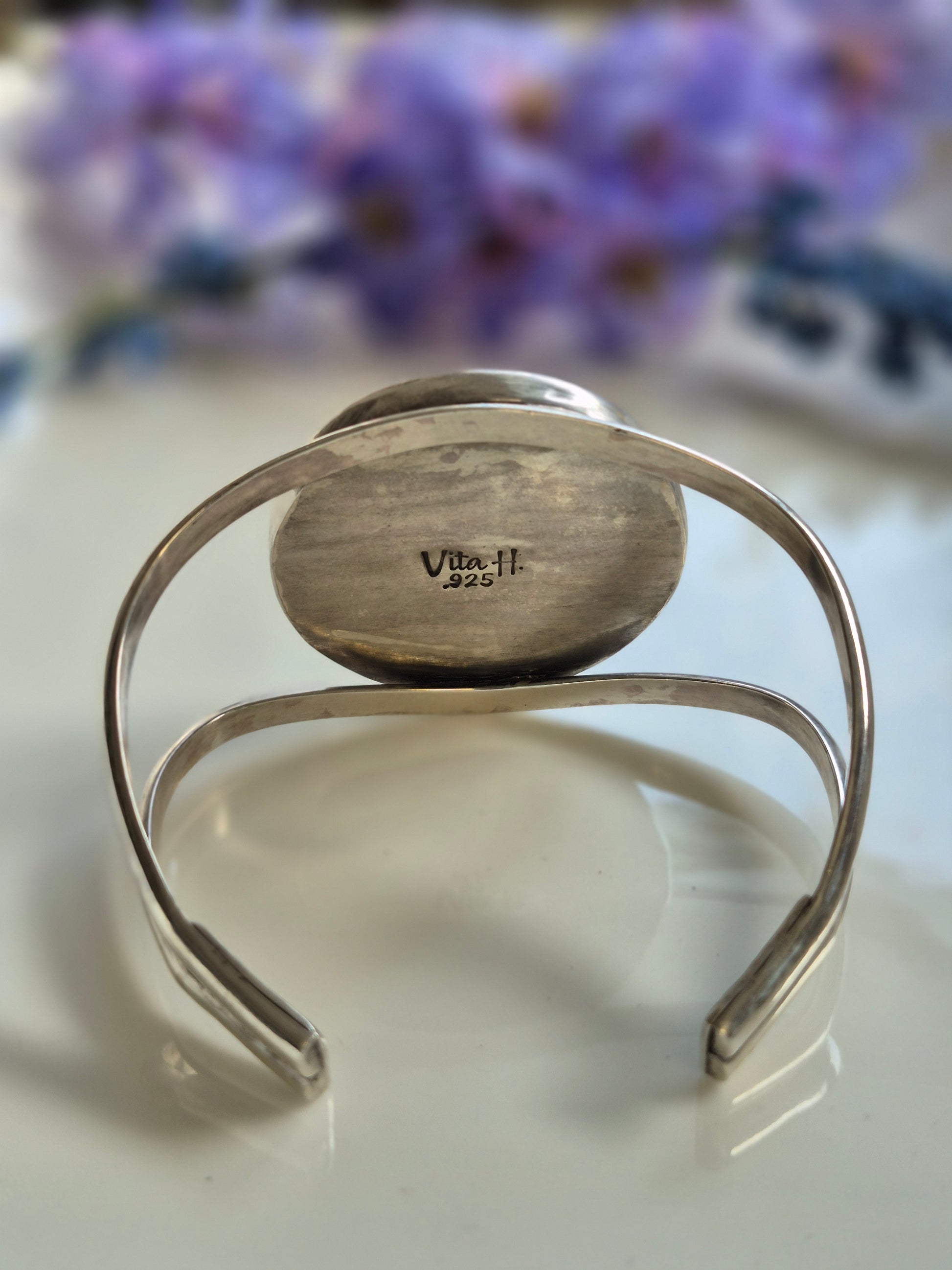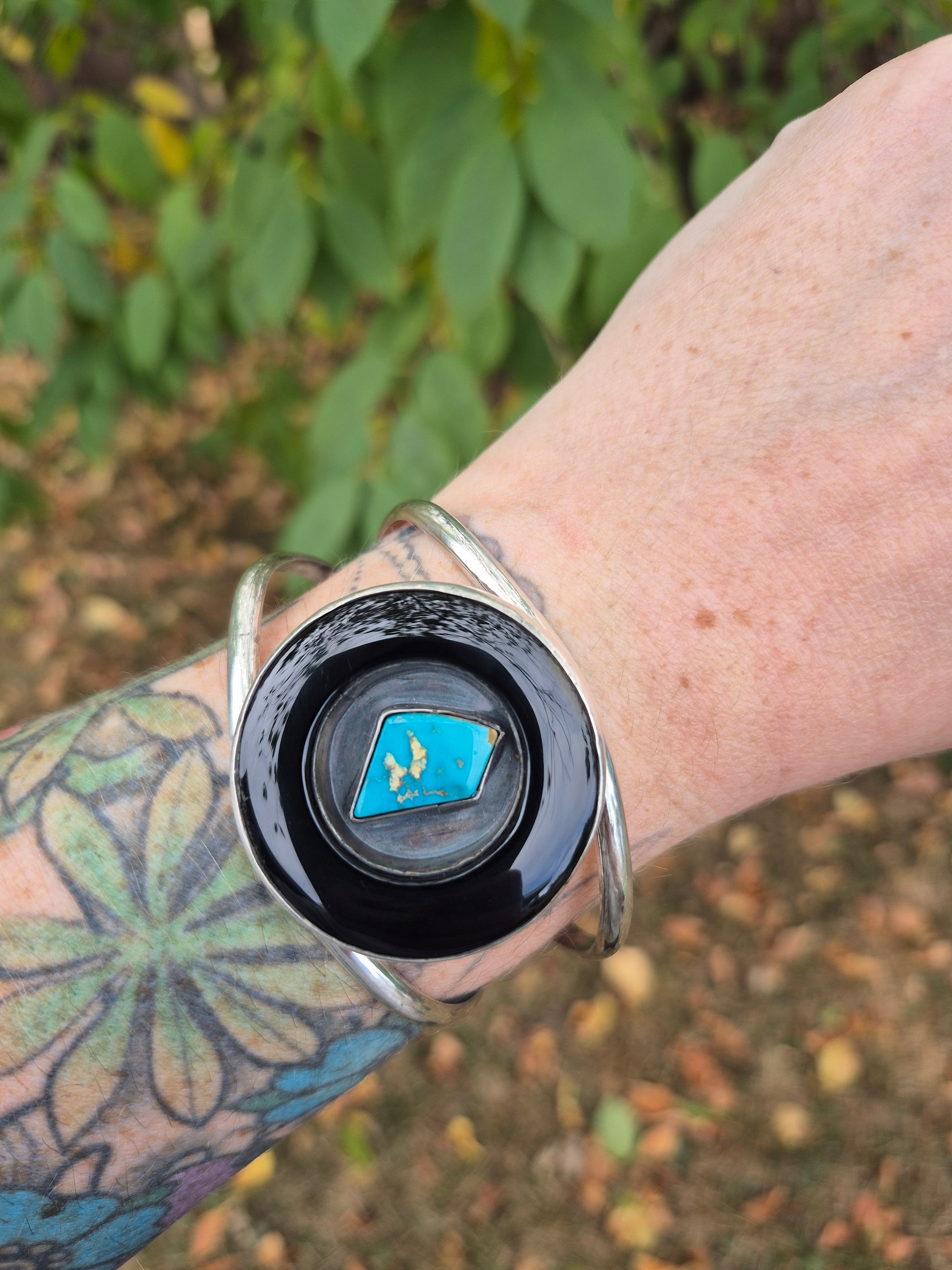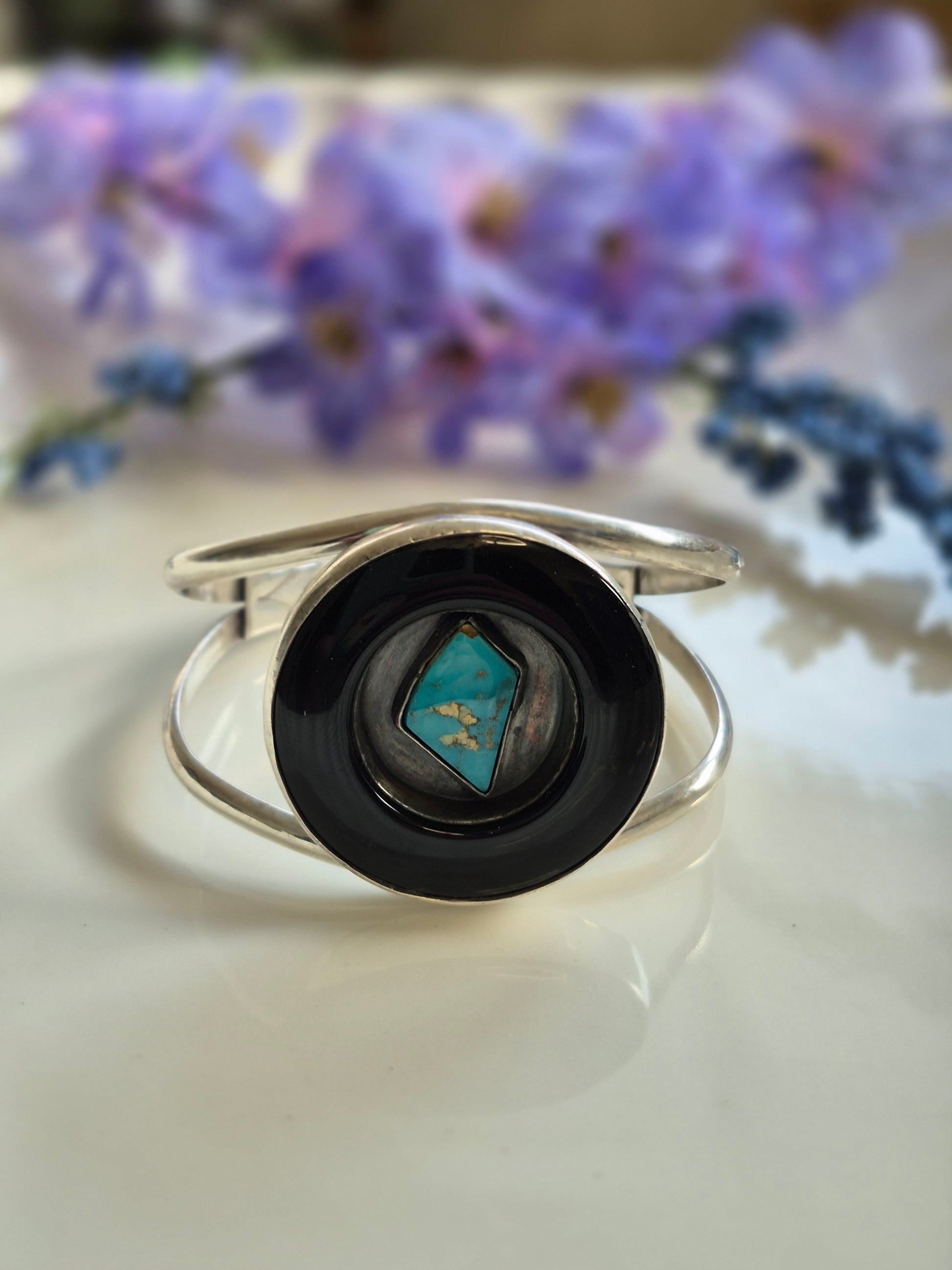 This handcrafted sterling silver cuff is a bold statement of contrast and transformation. Designed in a shadowbox style, it features a deep black onyx outer stone framing a vibrant teal turquoise center. The pairing creates depth and dimension, symbolizing balance between darkness and light, grounding and renewal.
