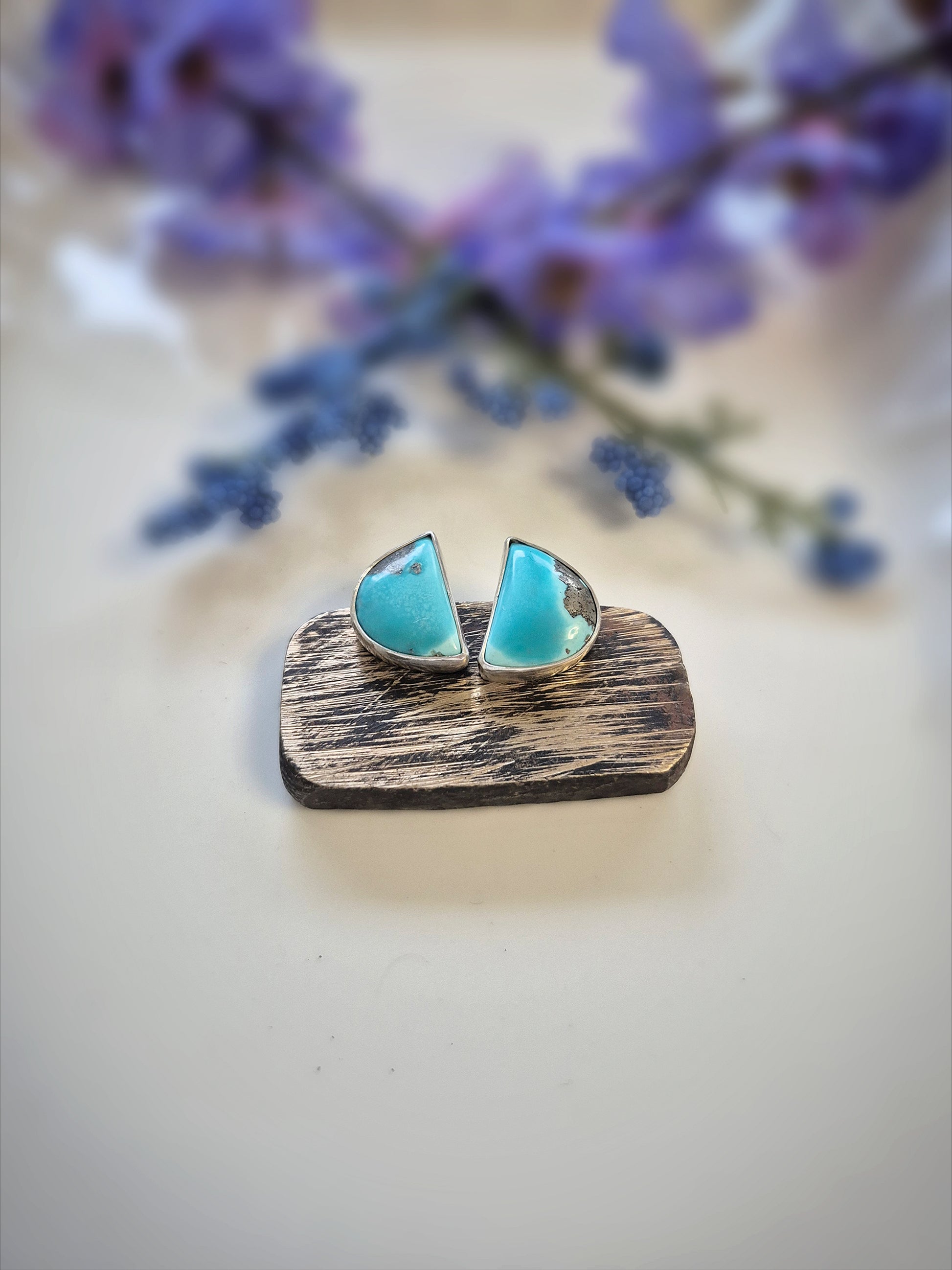 The Prairie Strength collection is shaped by quiet resilience. Turquoise in shades of sky and open land, cut into simple crescent forms and strong lines. These studs carry the calm power of wide plains—steady, grounding, and made to remind you of your own strength every time you wear them.